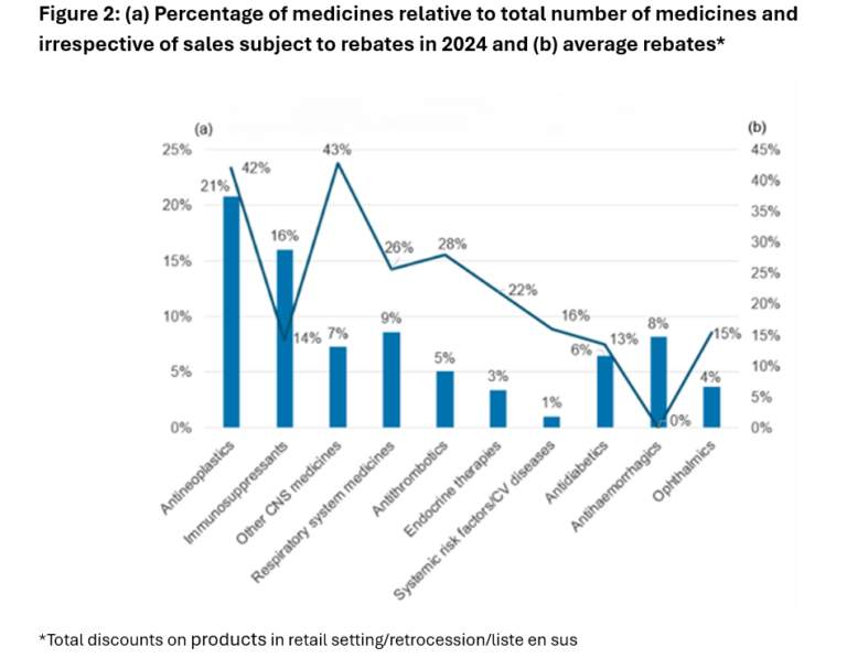 As these rising levels of pharmaceutical expenditure place increasing pressure on the healthcare budget, an important part of the adjustment is occurring through the growing weight of rebates applied to reimbursed medicines (>10% increase in total rebates from 2023 to 2024).