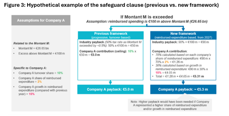 Contributions are now calculated based on two metrics. 70% of contributions are calculated based on each company’s share of reimbursed expenditure, and 30% are based on the growth of that expenditure compared with the previous year, with a 12% cap on each company’s reimbursed expenditure limiting individual exposure.6 An example of the impact on companies is provided in Figure 3. By shifting from turnover to reimbursed spending and establishing a clear threshold, the system provides greater predictability for the industry, but could be associated with greater amounts to be paid back by companies.