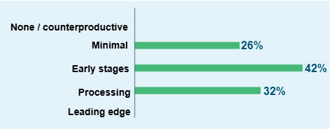 – Progressing – Pilot programs and selective deployments show promise, but scalability and coordination remain limited.