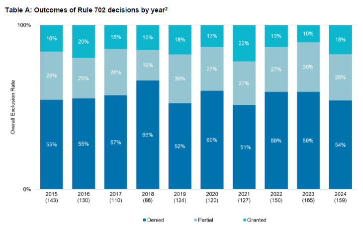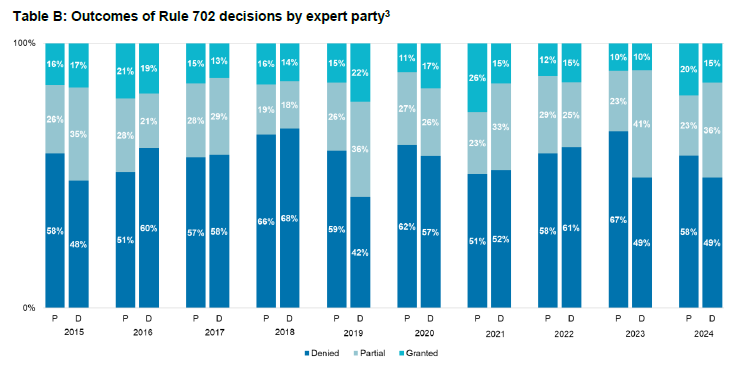 Rule 702 decision trends are based on our review of available US district court decisions concerning damages experts in patent infringement matters that have sufficient information for analysis. The number of Rule 702 decisions available to analyze in 2024 was 159, slightly lower than 2023 (165 decisions) but higher than any other year during the 2015–2024 period analyzed in this newsletter. The overall exclusion rate in such decisions—where the court either granted or partially granted a motion to exclude or limit a damages expert’s testimony—was approximately 46%, higher than the 2022 and 2023 overall exclusion rates of approximately 41%. Overall exclusion rates from 2015 through 2024 are presented in Table A below.