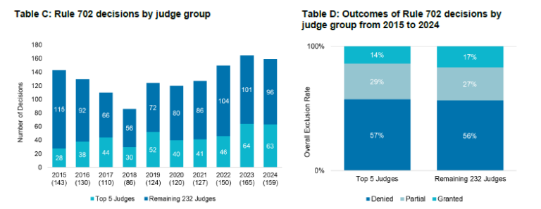 From 2015 through 2024, 237 different judges have ruled on at least one Rule 702 decision that has been analyzed in this newsletter. Five judges have ruled on over 34% of these decisions (446 out of 1,314 total decisions). Each of these five judges has ruled on at least 64 decisions over the 2015–2024 period, while the average number of decisions for the remaining 232 judges is fewer than four, with no judge ruling on more than 30 decisions. Despite the difference in the number of decisions per judge, each group of judges (top five compared with the remaining 232) had similar overall exclusion rates, demonstrating general consistency with how Rule 702 is applied by judges with different levels of Rule 702 experience. The number of decisions and overall exclusion rates for each group of judges are presented in Tables C and D below.