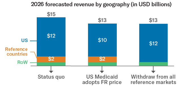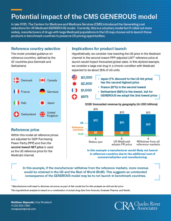 In late 2025, The Centers for Medicare and Medicare Services (CMS) introduced the Generating cost reductions for US Medicaid (GENEROUS) model. Currently, this is a voluntary model but if rolled out more widely, manufacturers of drugs with large Medicaid populations in the US may choose not to launch those products in benchmark countries to preserve US pricing opportunities.