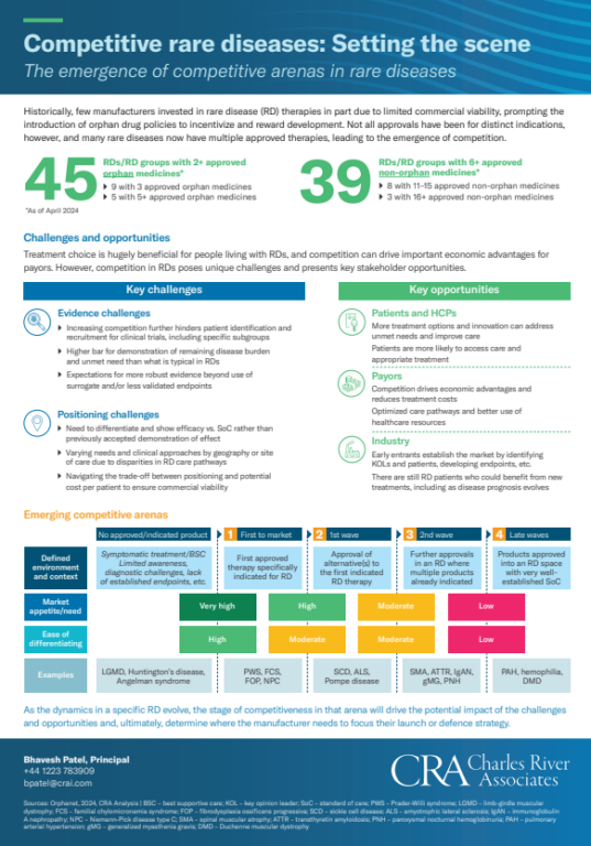 In the first installment of a new series on competitive categories in rare diseases, CRA Life Sciences’s Bhavesh Patel explores the emergence of competition in this space and the unique challenges and opportunities it presents across stakeholders and stages of a rare disease. This topic will also be featured at CRA’s upcoming event during WODC Boston. Stay tuned for the next piece in the series, where we’ll examine strategies for successfully navigating competitive rare disease landscapes.