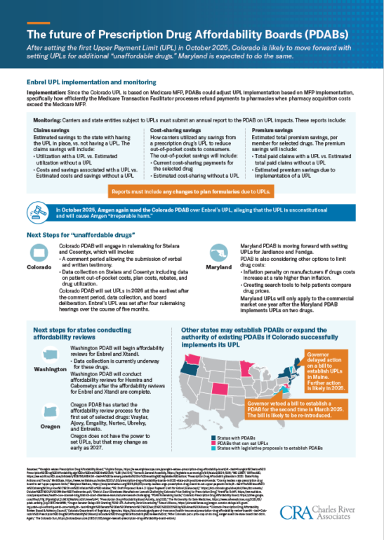 CRA’s Life Sciences consultants, Chris Nüesch and Laura Jenkins, provide an overview of these factors and examine potential next steps for Colorado and other state PDABs as they continue their affordability review process and look for opportunities to set UPLs for other drugs.