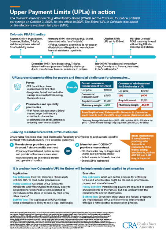 The Colorado Prescription Drug Affordability Board (PDAB) set the first Upper Payment Limit (UPL) for Enbrel at $600 per syringe on October 3, 2025, to take effect in 2027. The Enbrel UPL in Colorado was based on the Medicare maximum fair price (MFP).
